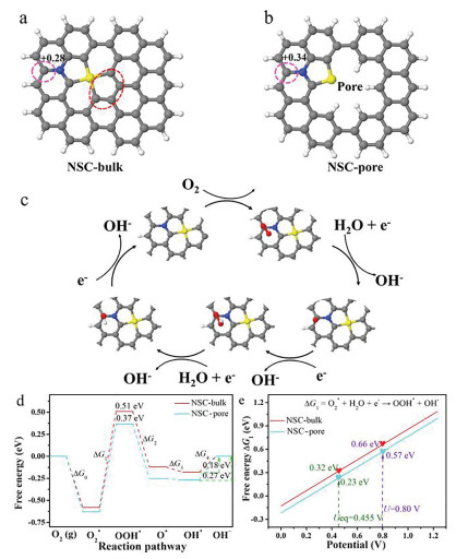 | Fig. 4. (a, b) The models for NS-bulk and NS-edge. The gray, blue, white and yellow represents carbon, nitrogen, hydrogen and sulfur atoms, respectively. (c) Proposed reaction pathway on NS-pore. (d) The free energy profiles of active sites on NS-bulk, NS-pore and NS-edge are drawn at equilibrium potential (0.455 V) corresponding to an alkaline media with pH 13. (e) Free energy of ∆G1 reaction steps as a function of electrode potential. | |