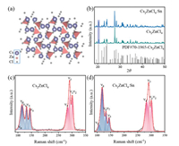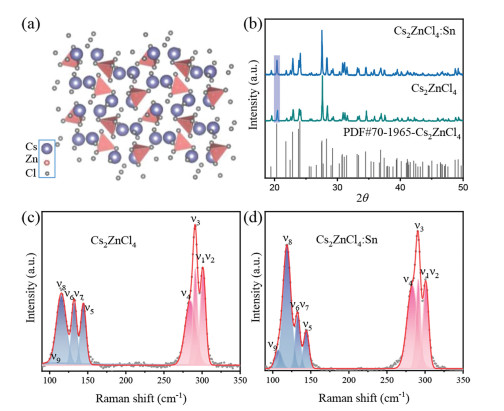 | Fig. 1. (a) Crystal structure of Cs2ZnCl4. (b) PXRD diffractograms of Cs2ZnCl4 and Cs2ZnCl4: Sn. Raman spectrum of Cs2ZnCl4 (c) and Cs2ZnCl4: Sn (d). | |