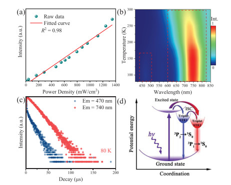 | Fig. 4. (a) Dependence of the emission intensity at 700 nm of Cs2ZnCl4: Sn on the excitation power at 300 K (λex = 405 nm). (b) Temperature-dependent PL spectra of Cs2ZnCl4: Sn. (c) PL decay curves of Cs2ZnCl4: Sn monitoring at 470 and 740 nm at 80 K (λex = 280 nm). (d) Possible schematic diagram of the energy level of Cs2ZnCl4: Sn. | |