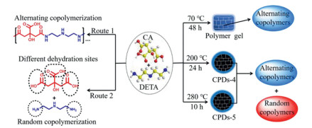 In conclusion, we have prepared five kinds of CPDs by using simple solvothermal or hydrothermal methods, and studied the structures of CPDs in order to obtain insight into interesting optical properties of these fluorescent emitters. Detailed structural characterization and optical properties reveal that the homogeneous polymer structures contained in CPDs are the main origin of excitation-wavelength independent FL, and the random copolymer structures contained in CPDs are the main origin of excitation-wavelength dependent FL. More importantly, we have achieved controllable preparation of excitation-wavelength independent, excitation-wavelength dependent and higher degree excitation-wavelength dependent fluorescent materials by simple tuning the reaction temperature. Looking toward the future, it is very meaningful to closely correlate the FL properties of CPDs with the accurate polymer structures.