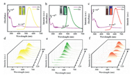 | Fig. 3. (a-c) UV–vis absorption and FL spectra for CPDs-1–3. Insets in (a-c): The images of the CPDs-1–3 in ethanol solvents under daylight and UV lamp (365 nm), respectively; (d-f) The FL spectra of CPDs-1–3 in ethanol solvents excited by different wavelength lights. | |