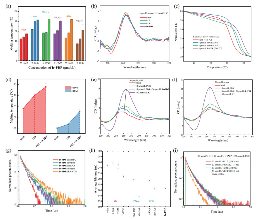 | Fig. 2. Interaction between Ir-PDP and oligonucleotides in vitro. (a) Ir-PDP induced a change in the melting temperature of G4, the concentration of the six G4 sequences was 5 µmol/L, and the melting temperature of G4 was tested with the addition of 10 µmol/L or 20 µmol/L Ir-PDP. The melting temperature of each G4 is obtained by sigmoid curve + slope fitting, and the error bar is obtained from fitting. (b) CD spectra of 5 µmol/L c-myc in the presence of 5 mmol/L KCl with different ligands. (c) CD melting curves of 5 µmol/L c-myc in the presence of 5 mmol/L KCl with different ligands. (d) Tm of 5 µmol/L c-myc (red) or NRAS (blue) in the presence of 5 mmol/L KCl without ligand and with 5 µmol/L PDS, or 5 µmol/L PDS + 5 µmol/L Ir-PDP. (e, f) CD spectra of G4 ligand interacting with G4 sequence. The curve "blank" is that 100 µmol/L of G4 sequence was denatured at 95 ℃ for 10 min and immediately added to Tris-HCl buffer (pH 7.4) without other components. In addition, PDS (10 µmol/L), PDS + Ir-PDP (10 µmol/L + 20 µmol/L) and KCl (100 mmol/L) were added to induce G4 formation. (e): 20 µmol/L c-kit; (f): 20 µmol/L c-myc. (g) Time-resolved phosphorescence decays of Ir-PDP in DMSO (10 µmol/L), buffer (10 mmol/L Tris-HCl buffer pH 7.4, 100 mmol/L KCl, 10 µmol/L Ir-PDP) or following the subsequent additions of ssRNA (20 µmol/L), hairpin (20 µmol/L) or RNA G4 (Tel22, 20 µmol/L) in above buffer. (h) Lifetime variation of Ir-PDP (10 µmol/L) in buffer (pH 7.4, black dots) or in the presence of different G4s (20 µmol/L, pH 7.4, 100 mmol/L KCl), ss/dsDNA (20 µmol/L, pH 7.4, 100 mmol/L KCl) and ss/dsRNA (20 µmol/L, pH 7.4, 100 mmol/L KCl). The error bar comes from the error caused by the exponential fitting. (i) Time-resolved phosphorescence decays of 20 µmol/L Ir-PDP in the presence of 100 mmol/L KCl, 20 µmol/L PDS and four different RNA G4s. | |
