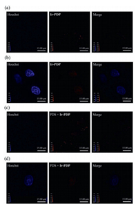| Fig. 4. Confocal laser scanning microscopy imaging of fixed MCF-7 cells. Staining of fixed MCF-7 cells with Ir-PDP (20 µmol/L, 12 h, red) and Hoechst 33342 (10 µg/mL, 5 min, blue): (a) pre-treatment with DNase Ⅰ (100 U/mL, 5 h); (b) pre-treatment with RNase A (1 mg/mL, 5 h); (c) pre-treatment with PDS (10 µmol/L, 12 h) before fixation and then DNase Ⅰ (100 U/mL, 5 h); (d) pre-treatment with PDS (10 µmol/L, 12 h) before fixation and then RNase A (1 mg/mL, 5 h). Ir-PDP: λex = 405 nm; λem = 600 ± 20 nm. Hoechst 33,342: λex = 405 nm; λem = 447 ± 20 nm. | |