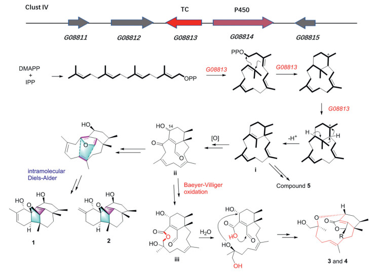 | Fig. 3. The cluster Ⅳ in the genome of P. hawaiiense FS482 responsible for the hawanoids biosynthesis and the possible biosynthetic pathway of 1‒5. | |