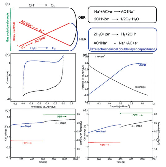 | Fig. 2. (a) Illustration of the mechanism for the decoupled water splitting using AC as relay. (b) CV curve of the AC electrode. (c) Charge/discharge with a current density of 1 mA/cm2 of AC in 1 mol/L NaOH. (d, e) Chronopotentiometry curves (Cell voltage vs. time) for the H2/O2 production steps (blue/black line) and the chronopotentiometry data (potential vs. time) of bifunctional (HER/OER) electrode (red/green line) at a current of 10 mA and 100 mA respectively. | |