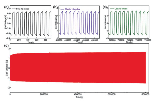 | Fig. 3. Chronopotentiometry curve (cell voltage as a function of time) for the decoupled water splitting using AC as relay with step time of 50 s at a constant current of 200 mA: (a) The first ten cycles; (b) the middle ten cycles; (c) the last ten cycles. (d) Cycle stability of the H2/O2 generation cycle during 800, 000 s. | |