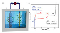 | Fig. 4. (a) Cell voltage and Potential curves of the hydrogen production (left part) and the oxygen production (right part) at a current of 1 A/cm2. (b) The visual configuration of decoupled water electrolysis with NiFe-LDH@Pt-coated Ti-mesh (10 × 10 cm2) and AC relay (10 × 10 cm2). Cell voltage vs. time (above display) for the H2 production steps (c) and the O2 production steps (d) at a current of 10 A and 1 A respectively. | |