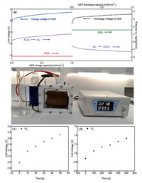 Meanwhile, large-area AC electrodes (10 × 10 cm2) and GEE electrodes (10 × 10 cm2) were assembled into a decoupling electrolysis device (Fig. 4b and Fig. S13 in Supporting information). The two step H2/O2 production processes are visualized as shown in Video in Supporting information. Drainage method was used to quantify the substep production of H2/O2 over a certain period of time and was visualized (Video in Supporting information). In such a device, the decoupling can be achieved using different current flow, as an example, in the first step, low current density (1 A) (with the AC electrode discharge) was used to produce oxygen. In the second step, a large current (10 A) was used to rapidly produce large amount of high-purity hydrogen. Such a strategy may help to produce high-purity hydrogen within a short time. Figs. 4c and d were HER/OER process voltage over time curve. The calculated Faradaic efficiency for the hydrogen production was close to 100%.