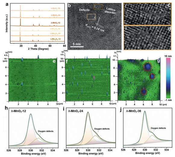 | Fig. 1. (a) XRD patterns of LiMn2O4-T and λ-MnO2-T. (b) HR-TEM images of λ-MnO2-24 sample. (c, d) HR-TEM images marked in (b). (e-g) 3D AFM images of the λ-MnO2-T samples with 10 µm × 10 µm area scan. (h-j) High-resolution O 1s XPS results of λ-MnO2-T. | |