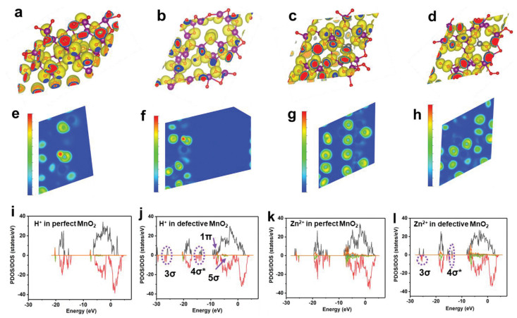 | Fig. 3. (a-d) Charge densities, (e-h) electron localization function (ELF, the value of ELF ranges from 0 to 1, a value of 1 (red area) means that the electron is completely localized, and a value of 0 (blue area) may mean that the electron is completely delocalized). (a, e) Perfect MnO2 and (b, f) defective MnO2 with H+ insertion. (c, g) Perfect MnO2 and (d, h) defective MnO2 with Zn2+ insertion; The P(DOS) curves of H+ inserted in perfect (i) and defective (j) MnO2; P(DOS) of Zn2+ inserted in perfect (k) and defective (l) MnO2. | |