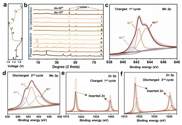 | Fig. 4. (a) GCD curves at 50 mA/g for the initial cycle and the discharging profile at the 2nd cycle. (b) The corresponding ex-situ XRD patterns at different charging/discharging states. (c-f) High-resolution Mn 2p and Zn 2p XPS results at the first charged and the second discharged state. | |