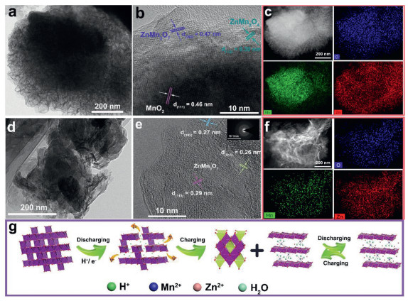 | Fig. 5. TEM, HR-TEM and EDX mappings of λ-MnO2-24 electrode after first charging (a-c) and (d-f) the second discharging. (g) Illustration of the electrochemical reaction process. | |