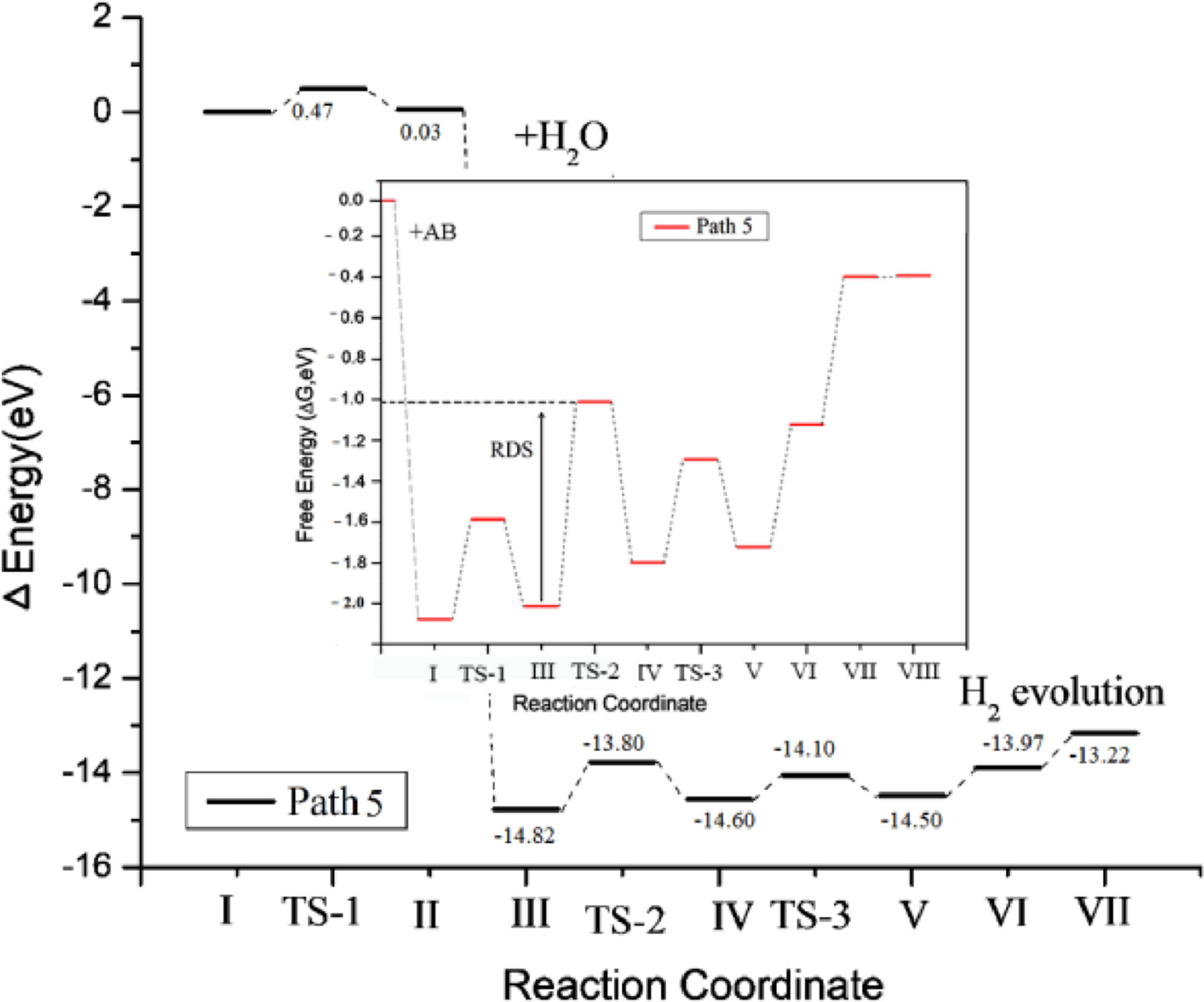 Throughout the description of the reaction process of the five hydrolysis mechanisms, we found that the RDS of path 3 and path 5 is about 1.0 eV. This shows that for the entire reaction process, when the ambient temperature is slightly higher than room temperature, both path 3 and path 5 could happen spontaneously. Between 293~313 K, experimental studies have shown that as the reaction temperature increases, the rate of H production gradually increases and the activation energy is gradually decreasing.