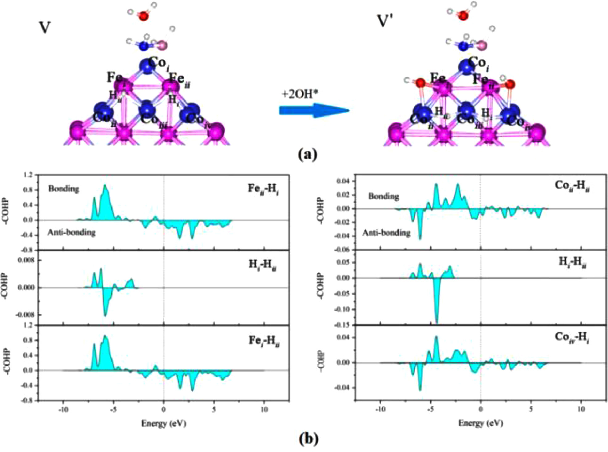| Fig. 4. (a) *OH− adsorption effect on the structure V and (b) atom –COHP of the structure V. | |