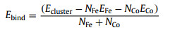 where Ecluster, EFe and ECo are the total energies of Fe36Co44 cluster, Fe and Co atoms, respectively. NFe and NCo are indicated as the numbers of Fe and Co atoms involved in the cluster (NFe + NCo = 80). The binding energy of Fe36Co44 nanostructure is −3.50 eV, which is leading to a stronger interatomic bond.