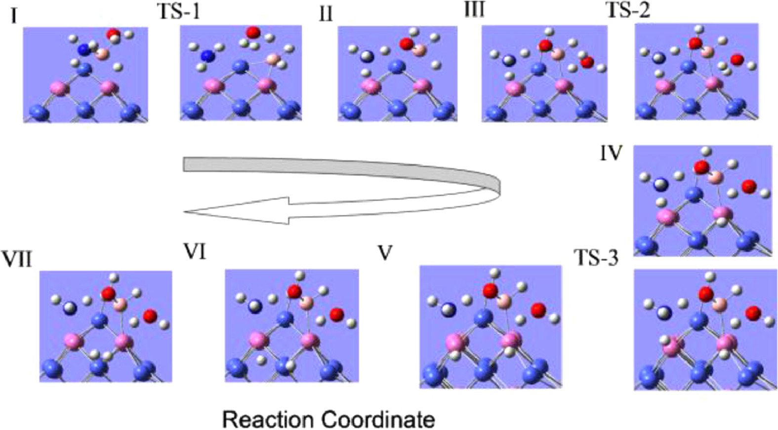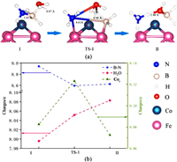 From the perspective of bond energy, we can find that the bond energy of B—N bond is weak, and it is also easy to break firstly in the catalytic process. Therefore, we calculated the reaction path where the B—N bond was firstly broken under H2O co-adsorption. This process only needs to overcome a small energy barrier, as shown in Fig. 2. After the B—N bond breaken, H2O molecule is inserted between B atom and N atom to form small molecular groups with AB, as shown in Fig. 5a structure II. At this time, the O—H bond in the H2O molecule has been broken, and the length of one O—H bonds becomes 1.40 Å. Such molecular groups are conducive to the release of H atoms. In response to this process, Fig. 5b describes the change in charge. In the process of breaking the B—N bond, B—N as a whole loses electrons and the interaction is weakened. In the transition state (TS-1) of the process, the electrons lost by B—N accumulate on the surface of Co atoms and H2O molecules, leading to the breaking of H—O bonds in H2O molecules.