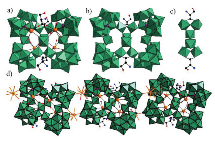 | Fig. 1. (a) The polyhedron representation of the basic polyoxoanion unit in 1: [{As4W44O137(OH)18(H2O)2(DL-Ser)2}{La2(H2O)5(DL-Ser)}2]8–. (b) The polyhedron representation of the polyoxoanion unit of [As4W44O137(OH)18(H2O)2(DL-Ser)2]18‒. (c) The centrosymmetric Z-shaped hexatungstate [W6O23(OH)2(DL-Ser)2]14‒ fragment. (d) 1D linear chainlike polyoxoanion 1a linked by peripheral La3+ ions. | |