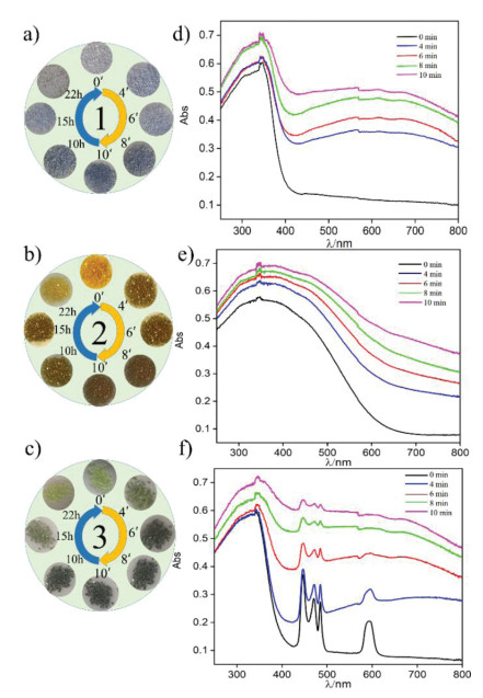 | Fig. 2. (a–c) The color evolution for 1‒3 irradiated after 0, 4, 6, 8, 10 min and the color fading in the dark under ambient conditions after 10 h, 15 h, 22 h. (d–f) The evolutions of the solid-state diffuse reflectance absorption spectra of 1‒3 with irradiation times of 0, 4, 6, 8, 10 min. | |
