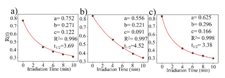 | Fig. 3. The plots of reflectivity R(t) vs. t for 1 (a) 2 (b) and 3 (c) measured at 675 nm, 575 nm, 673 nm for 0, 4, 6, 8 and 10 min irradiation. | |