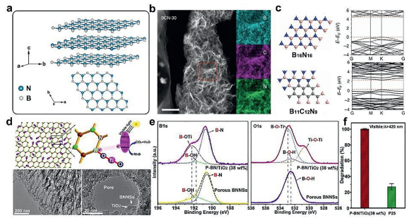 | Fig. 10. (a) Crystal structure of h-BN. (b) Typical TEM dark-field image of BCN sample and the elemental mapping images of B, C and N of the enlargement of selected-area in the picture. Scale bar: 300 nm. (c) The optimized structure of B16N16 and B11C12N9 with the corresponding calculated energy band. Reprinted with permission [111]. Copyright 2015, Nature. (d) Schematic diagram for the photocatalytic reaction of Rhodamine B by porous BN/TiO2 hybrid nanosheets with new chemical bonding specie B-O-Ti under simulated visible light and TEM images for starting porous BN nanosheets and HRTEM images for a hole decorated by TiO2 nanoparticles. (e) XPS spectra of B 1s, O 1s with porous and non-porous BN nanosheets, porous and non-porous BN/TiO2 hybrid nanosheets. (f) Photodegradation of Rhodamine B under visible light λ > 420 nm by P25 and porous BN/TiO2 hybrid nanosheets. Reprinted with permission [112]. Copyright 2017, Elsevier. | |