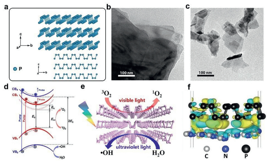 | Fig. 11. (a) Crystal structure of BP. (b) Low resolution TEM image of bulk BP and (c) 2D BP. Reprinted with permission [118]. Copyright 2016, American Chemical Society. (d) Mechanism of photocatalytic reactive oxygen species generation over ultrathin BP nanosheet. (e) Schematic illustration of the subband structure of ultrathin BP nanosheet as well as the photoexcitation and photocatalytic processes occurring therein. Reprinted with permission [119]. Copyright 2018, American Chemical Society. (f) Side-view differential charge density map of g-C3N4 and phosphorene. Reprinted with permission [122]. Copyright 2018, Wiley-VCH. | |
