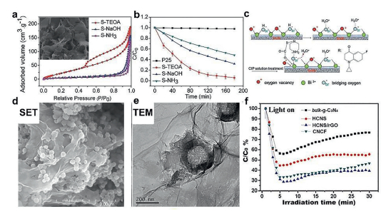 | Fig. 12. (a) Nitrogen adsorption–desorption isotherms of the sample S-TEOA, S-NaOH and S-NH3 (inset is SEM image of the S-TEOA). (b) Photocatalytic performance for CIP solution under visible light irradiation of CIP solution containing 150 mg of P25 and the samples S-TEOA, S-NaOH, S-NH3. (c) Diagrammatic adsorption modes of CIP on the surface of the sample S-TEOA. Reprinted with permission [133]. Copyright 2017, Royal Society of Chemistry. (d) SEM and (e) TEM images of HCNS/rGO. (f) Visible-light photocatalytic performance of bulk-g-C3N4, HCNS, HCNS/rGO, and CNCF samples for the removal NO from air. Reprinted with permission [139]. Copyright 2016, Royal Society of Chemistry. | |