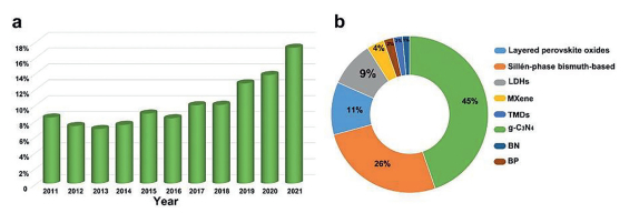 | Fig. 14. (a) The results for number of publications on photocatalysis for environmental applications and the share of literature on layered photocatalytic nanomaterials among them from 2011 to 2021. (b) The proportion of photocatalysts for each search query in the number of publications on layered photocatalytic nanomaterials. Date from Web of Science (WOS). | |