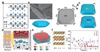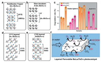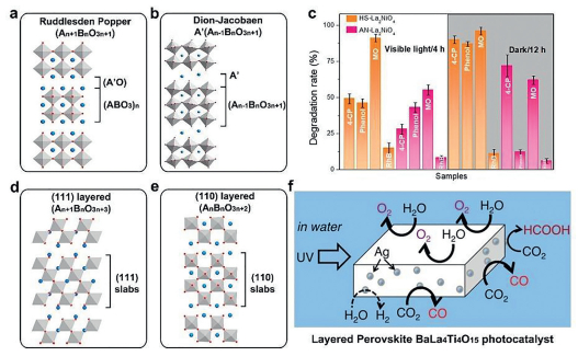 | Fig. 3. (a) Crystal structures of Ruddlesden Popper, (b) Dion-Jacobaen, (d) (111) layered and (e) (110) layered perovskite oxides. (c) Degradation of various organic pollutants (4-CP, phenol, MO, RhB) by using hollow spheres La2NiO4 and aggregated nanoplate La2NiO4 as the catalyst under visible-light irradiation and in the dark. Reprinted with permission [25]. Copyright 2019, American Chemical Society. (f) Mechanism of photocatalytic CO2 reduction over BaLa4Ti4O15 with Ag cocatalysts loaded by several methods. Reprinted with permission [28]. Copyright 2011, American Chemical Society. | |