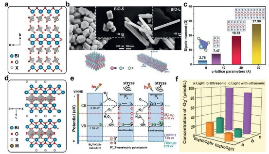 | Fig. 5. (a) Crystal structure of BiOIO3. (b) The morphology evolution and the corresponding schematic illustration for BIO-S and BIO-L. (c) The dipole moment (z-axis) of IO3 polyhedra and the BiOIO3 unit cells with different c-lattice lengths. Reprinted with permission [44]. Copyright 2020, Wiley-VCH. (d) Crystal structure of Bi4MO8X (M = Ta, Nb; X = Cl, Br). (e) Diagram of band bending of Bi4NbO8Br under different conditions. (f) The concentration of •O2− over Bi4NbO8X (X = Cl, Br) under light, ultrasonic and simultaneous light and ultrasonic irradiation within 2 h. Reprinted with permission [51]. Copyright 2019, Wiley-VCH. | |