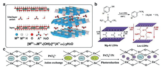 | Fig. 6. (a) Structure of LDHs. (b) Leu-LDHs catalyzed chemoselective O-methylation of substituted phenols and thiophenols with DMC and the schematic structural models of Mg-Al LDHs and Leu-LDHs. Reprinted with permission [57]. Copyright 2013, Elsevier. (c) Schematic illustration for synthesis of nanoPt intercalated Zn-Ti LDHs composite (Zn-Ti LDHs; subsequent exchange of PtCl62− with anions of CO32−; followed by photoreduction to form the assembly of Pt/Zn–Ti LDHs. Reprinted with permission [58]. Copyright 2014, Elsevier. | |