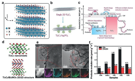 2.4. MXeneA large family of early transition metal carbides and/or nitrides with the layered structures is named "MXene", which has received widespread attention as a rapidly rising star in the field of photocatalysis [61,62]. MXene consists of Mn+1Xn stacked slices. M is the transition metal, including Ti, Ta, Zr, Mo, etc. X represents the C or N elements held together by hydrogen bonds or van der Waals interactions. At the same time, the surfaces of the MXene layers are typically terminated with OH, O and F. Thus, the general formula Mn+1XnTx is generated, herein Tx represents the x surface terminating group (Fig. 7a) [63,64]. MXene has excellent structural stability, tunable bandgap (0.92-1.75 eV), ideal electronic structure, and efficient electrons and holes anisotropic mobility, becoming one of the most potential photocatalytic nanomaterials in environmental governance [65]. In general, most MXenes serve as co-catalysts in the photocatalytic reactions, and researchers use MXene to modify semiconductor photocatalysts to improve their rapid photoexcited carriers recombination, thereby increasing the quantum efficiency and photocatalytic activity. Among these modification strategies, MXene Schottky junction and heterostructure can effectively accelerate the photocatalytic performance by adjusting the electronic structure. Cai et al. successfully synthesized Ag3PO4/Ti3C2 Schottky junction catalyst by electrostatic self-assembly method (Fig. 7b) [66]. Due to the formation of sufficiently and closely contacted interface between the two phases Ti3C2 enhanced the photodegradation activity and photocorrosion resistance of Ag3PO4 by capturing the unidirectional electron flow across Schottky barrier (Fig. 7c). It can be observed that the photocatalytic performance of Ag3PO4/Ti3C2 for tetracycline hydrochloride has a relatively small loss after 8 cycles, which still maintained 68.4%. In addition, the high-efficiency photocatalytic reduction of Cr6+ over AgI/Ti3C2 system also strongly indicated that Ti3C2 as a versatile "electron sink" can be used in a wide range of environmental treatments. Another advantage of MXene as a co-catalyst is that it has a layered structure and abundant surface functional groups, which can provide favorable conditions for the construction of heterojunctions. Cao et al. fabricated the 2D/2D heterojunction by growing BiWO6 nanosheets in situ on the Ti3C2 nanosheets (Fig. 7d) [67]. The ultra-thin structure and abundant terminal groups of Ti3C2 provided a large contact area and tight interface for the Ti3C2/Bi2WO6 heterojunction photocatalyst, which greatly improves the charge transfer capacity. Thus, Ti3C2/Bi2WO6 heterojunction demonstrated 4.6 times higher activity than that of primitive Bi2WO6 ultrathin materials for the photocatalytic production of CH4 and CH3OH, respectively (Figs. 7e and f).