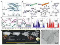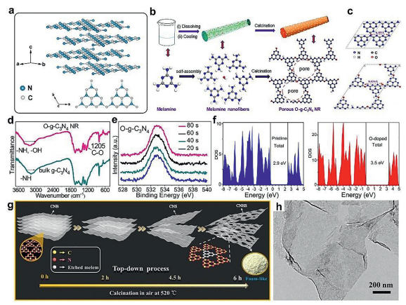 | Fig. 9. (a) Crystal structure of g-C3N4. (b) Schematic illustration of O-g-C3N4 nanofibers formation. (c) Optimized structures of pristine g-C3N4 and O-g-C3N4. (d) FT-IR spectra of bulk g-C3N4 and O-g-C3N4. (e) The high-resolution XPS spectra upon Ar+ spluttering of O. (f) Density of state (DOS) of pristine g-C3N4 (blue) and O-g-C3N4 nanofibers (red). Reprinted with permission [93]. Copyright 2018, Elsevier. (g) Top-down process for preparation of foam-like holey ultrathin g-C3N4 nanosheets. (h) TEM images of g-C3N4 nanosheets. Reprinted with permission [96]. Copyright 2016, Wiley-VCH. | |