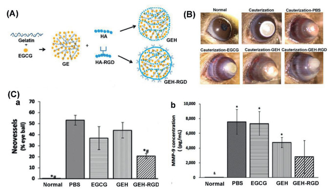 | Fig. 1. (A) Synthesis of EGCG loaded GEH-RGD nanoparticles. (B) EGCG nanoparticles inhibit neovascularization in chemically cauterized CNV. Typical images of normal cornea burned cornea, and cornea treated with PBS, EGCG, GEH, or GEH-RGD on day 7 after chemical burn. (C) The corneal vascular area (a) and MMP-9 (b) of all treated groups were quantified. Reproduced with permission [22]. Copyright 2020, MDPI. | |