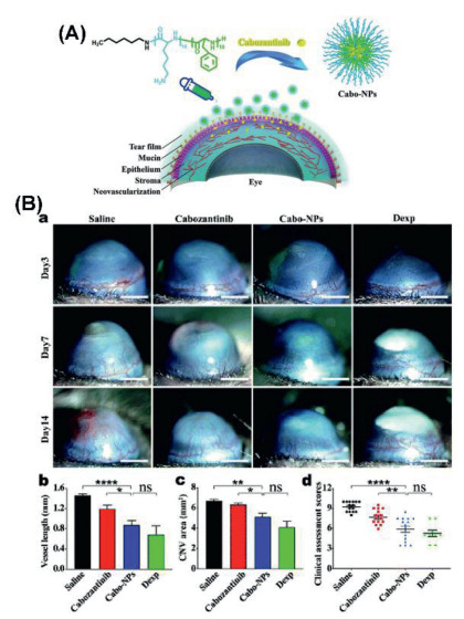Cabozantinib, also known as XL184, is a multi-targeted small-molecule TKIs that has been applied to remedy various solid tumors by blocking VEGF signaling pathway [29,30]. The ability to inhibit the development of vascular endothelial cells also enables cabozantinib to be a candidate drug for CNV treatments. To reduce its systemic toxicity, Han et al. constructed N-carboxyanhydride ring-opening polymerization (NCA-ROP) and then based on cationic amphiphilic polypeptide Lys (NH2)-Phe to encapsulate lipophilic cabozantinib into self-assembled micelles (Cabo-NPs) [31]. Cationic Cabo-NPs could bind with corneal surface mucins by electrostatic action to avoid rapid clearance and prolong the retention time in the eye, thereby enhancing its bioavailability (Fig. 2A). Afterwards, they used an alkali burn-induced CNV model to evaluate the efficacy of Cabo-NPs. Cabo-NPs showed stronger anti-CNV effects than other groups via strong inhibition of pro-inflammatory factors and pro-angiogenic factors (Fig. 2B-a). The amount of angiogenesis reached the highest level on day 14. The saline group exhibited the most severe CNV accompanied by turbidity and edema. There was no significant difference in the length of blood vessels and neovascularized area between saline group and cabozantinib group, indicating that cabozantinib alone had no significant inhibitory effect on CNV. In contrast, vessel length and neovascularized area were significantly reduced in Cabo-NP-treated mice (Figs. 2B-b & c). Meanwhile, the positive control group of Dexp, showed similar clinical examination score as Cabo-NPs (Fig. 2B-d), indicating the potential value of Cabo-NPs for further clinical application.