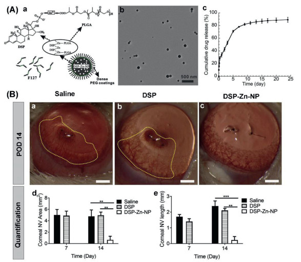 | Fig. 3. (A) Preparation scheme of DSP-Zn-NP (a), TEM image of DSP-Zn-NP (b) and cumulative drug release (c). (B) Typical slit-lamp images of rat cornea after SCT treatment at 7 and 14 days (a-c), quantize CNV area (d) and length (e). Reproduced with permission [36]. Copyright 2019, Elsevier Inc. | |