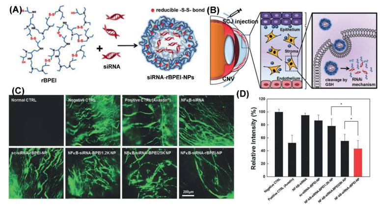 Among diverse siRNA carriers, polyethyleneimine (PEI) is considered to be a latent gene carrier in consideration of its functions to interact electrically with negatively charged siRNA and condense it into nanoparticles [60]. Accordingly, Han et al. synthesized a siRNA delivery system based on reducible branched-polyethylene imine (rBPEI) and applied it in CNV treatment (Fig. 5A) [61]. After SCT injection of siRNA-rBPEI-NPs, the drug was accumulated in vascular endothelial cells, and the -S-S- bond was reduced by overexpressed glutathione (GSH), thus inducing the depolymerization of the nanoparticles and the release of siRNA (Fig. 5B). And the nuclear factor kappa-light-chain-enhancer of activated B cells (NF-κB) was studied due to its important role in VEGFR3 expression. The degree of neovascularization was quantified by fluorescence intensity normalization (Figs. 5C and D). The results showed that NF-κB-siRNA-rBPEI-NPs had the strongest anti-angiogenesis effect, which was significantly higher than that of naked NF-κB-siRNA. The result implied that siRNA encapsulated in rBPEI could effectively retain in corneal tissues for a long time, thus ensuring the therapeutic effect of siRNA in the targeted area.