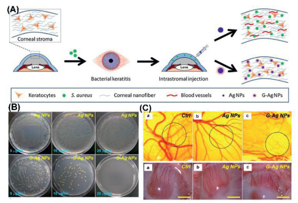 | Fig. 7. (A) Schematic diagram of G-Ag NPs for treatment of bacterial keratitis. (B) Staphylococcus aureus images on LB agar plates 24 h after exposure to Ag NPs or G-Ag NPs at different concentrations. (C) After injection of PBS (a), Ag NPs (b) and G-Ag NPs (c) pretreatment cellulose filter paper for 24 h, typical light microscope images of CAM vessels and slit-lamp images of VEGF-A165 induced rabbit CNV 3 days later. Reproduced with permission [74]. Copyright 2018, Elsevier Inc. | |