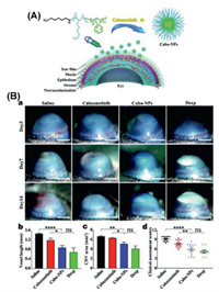 | Fig. 2. (A) Schematic diagram of preparation and CNV inhibition of mucoadhesive Cabo-NPs. (B) Anterior eye segment photos represent morphological differences caused by different treatments after alkali burn in mice (a); after being treated for 14 days, the vessel length (b) and neovascularized (c) were measured; (d) clinical evaluation score reflecting the therapeutic effect of corneal alkali burn. Reproduced with permission [31]. Copyright 2020, The Royal Society of Chemistry. | |