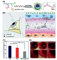| Fig. 4. (A) Synthesis of glycopolymers nanoparticles. (B) Schematic diagram of CNV inhibition by bio-adhesion, epithelial cell penetration, and drug release simulating glycyrrhiza bio-adhesion nanoagents. (C) Statistical analysis of CNV after 7 days of treatment. (D) Typical images of CNV 7 days after treatment. Reproduced with permission [37]. Copyright 2021, The Royal Society of Chemistry. | |