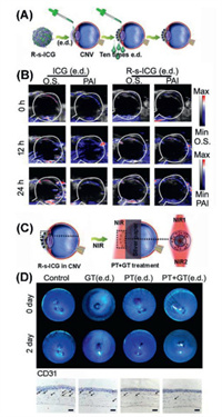 | Fig. 8. (A) Schematic diagram showing R-s-ICG administration. (B) In vivo PA-o.s. eye imaging and PA-ICG imaging after R-s-ICG application. (C) Schematic diagram of combined photo/gene therapy for CNV. (D) Slit-lamp images and CD31 staining of CNV model eyes before and after diverse treatment. Reproduced with permission [90]. Copyright 2020, Wiley-VCH Verlag GmbH & Co. KGaA. | |