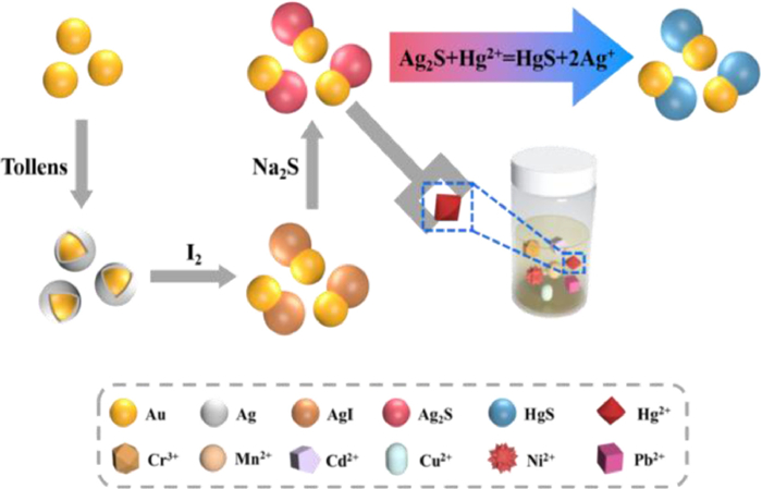 Tetrachloroauric acid, trisodium citrate, silver nitrate, iodine, and all the other inorganic compounds were bought from Sinopharm Chemical Reagent Co., Ltd. The silver ammonia solution (0.03 mol/L) was obtained by blending AgNO3 (0.1 mol/L, 6 mL), NH3·H2O (25%–28%, 1240 µL), and NaOH (3 mol/L, 650 µL). Stock solution of Hg(NO3)2 (1000 mg/L) was provided by TanMo Quality Testing Technology Co., Ltd. (Beijing, China). Sewage and tap water samples were collected from a sewage disposal exit in our campus and the lab, respectively. Deionized water was used for all experiments. UV–vis spectra were acquired from a spectrophotometer (UV-2450, Shimadzu). Transmission electron microscopy (TEM) images were captured by a JEM 1400 microscope (JEOL). High-angle annular dark-field scanning transmission electron microscopy (HAADF-STEM), high-resolution transmission electron microscopy (HRTEM), and energy dispersive X-ray (EDX) elemental mapping measurements were conducted on a Tecnai F30 microscope. Powder X-ray diffraction (XRD) was measured by a X'Pert diffractometer (PANalytical).