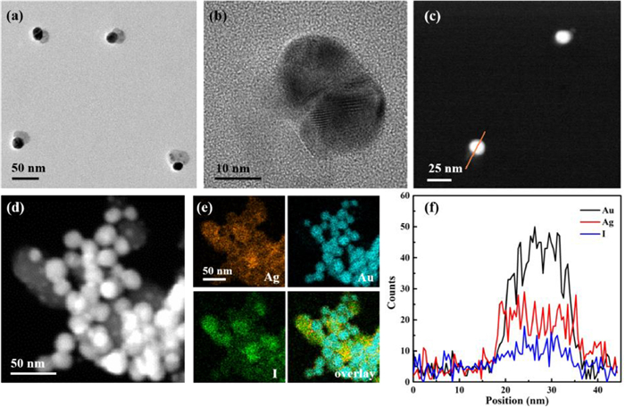 | Fig. 2. (a) TEM image, (b) HRTEM image, (c, d) HAADF-STEM image, (e, f) EDX elemental maps of Au/AgI NPs. Orange line in (c) represents the EDX line scan shown in (f). | |