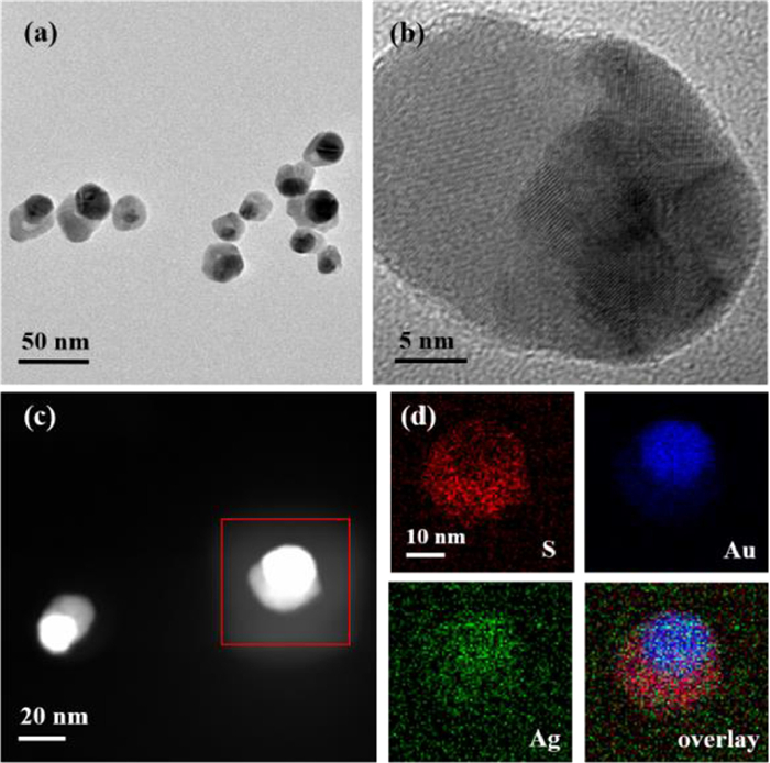 | Fig. 3. (a) TEM image, (b) HRTEM image, (c) HAADF-STEM image, (d) EDX elemental maps of Au/Ag2S NPs. | |