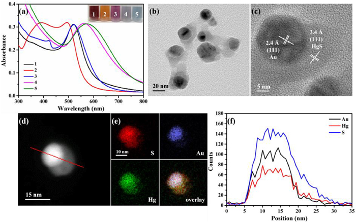 | Fig. 4. (a) UV–vis spectra of Au NPs (1), Au@Ag NPs (2), Au/AgI NPs (3), Au/Ag2S NPs (4), and Au/Ag2S NPs + Hg2+ (5). The inset is photograph of corresponding solutions. (b) TEM image, (c) HRTEM image, (d) HAADF-STEM image, (e, f) EDX elemental maps of Au/Ag2S NPs + Hg2+. Red line in d represents the EDX line scan shown in (f). | |