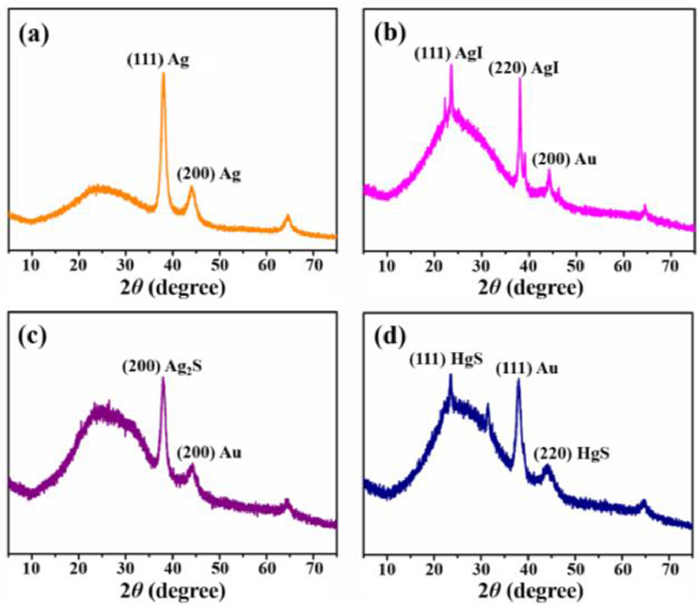 | Fig. 5. XRD results of (a) Au@Ag NPs, (b) Au/AgI NPs, (c) Au/Ag2S NPs, (d) Au/HgS NPs. | |