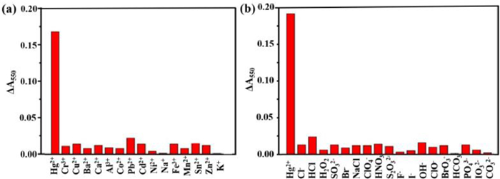 | Fig. 7. The ΔA550 of Au/Ag2S NPs reacting with Hg2+ or interfering compounds (K+, Na+, 30 mmol/L; Ca2+, Zn2+, Ba2+, Cd2+, Cu2+, Sn2+, Ni2+, Mn2+, Co2+, 2 mmol/L; Cr3+, Pb2+, Al3+, 1.5 mmol/L; Fe3+, 1 mmol/L) (a) and (NaCl, Cl−, HCO3−, CO32−, 50 mmol/L; HCl, HNO3, H2O2, IO32−, Br−, I−, OH−, 25 mmol/L; ClO−, F−, PO43−, ClO4−, S2O32−, 12.5 mmol/L; SO32−, BrO3−, 5 mmol/L) (b). | |