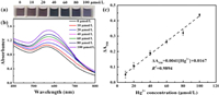 | Fig. 6. (a) Photographs and (b) UV–vis spectra of Au/Ag2S NPs reacting with various Hg2+ concentrations. (c) The linear relationship between decreased absorbance at 550 nm and Hg2+ concentrations. | |