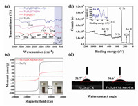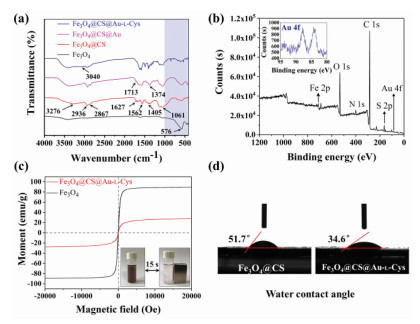 | Fig. 1. (a) FT-IR spectra of Fe3O4, Fe3O4@CS, Fe3O4@CS@Au, and Fe3O4@CS@Au-L-Cys. (b) XPS pattern of Fe3O4@CS@Au-L-Cys. (c) VSM profiles of Fe3O4 and Fe3O4@CS@Au-L-Cys. (d) Water contact angles of Fe3O4@CS and Fe3O4@CS@Au-L-Cys. | |