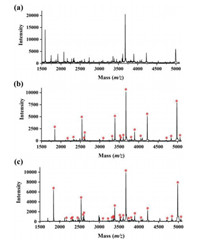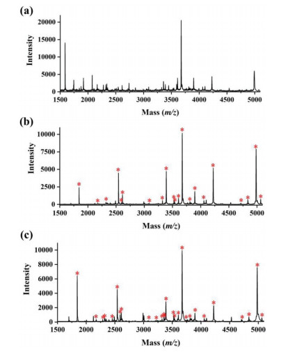 | Fig. 2. MALDI-TOF mass spectra of tryptic digests of 1000 fmol/µL standard HRP (a) before enrichment and after enrichment by (b) Fe3O4@CS and (c) Fe3O4@CS@Au-L-Cys. "*" indicates glycopeptide. | |