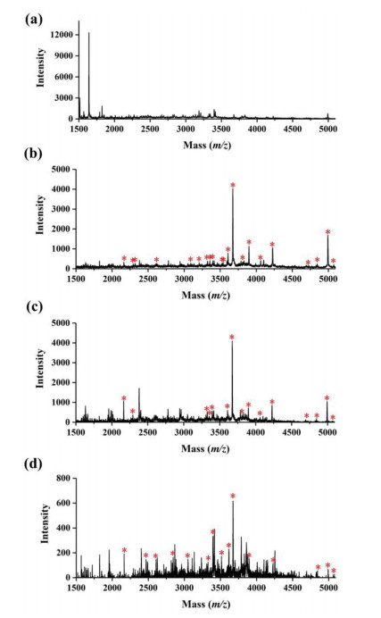 | Fig. 3. MALDI-TOF mass spectra of mixtures of HRP and BSA tryptic digests with a molar ratio of (a) 1:100 without enrichment and (b) 1:100, (c) 1:500, and (d) 1:1000 enriched by Fe3O4@CS@Au-L-Cys. "*" indicates glycopeptide. | |